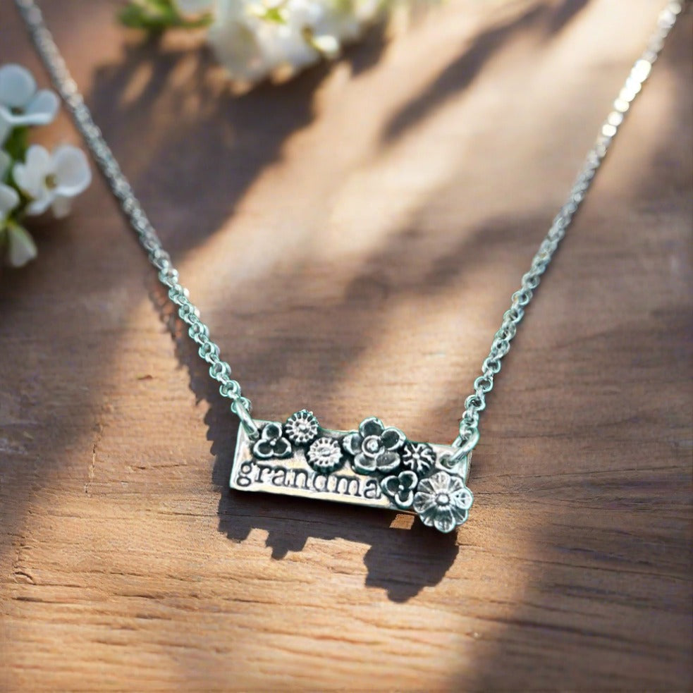 Grandma's Flower Garden Necklace features delicate flowers to symbolize each cherished loved one. Crafted from 99.9% fine silver, each necklace is meticulously handmade, ensuring that no two pieces will be exactly alike.